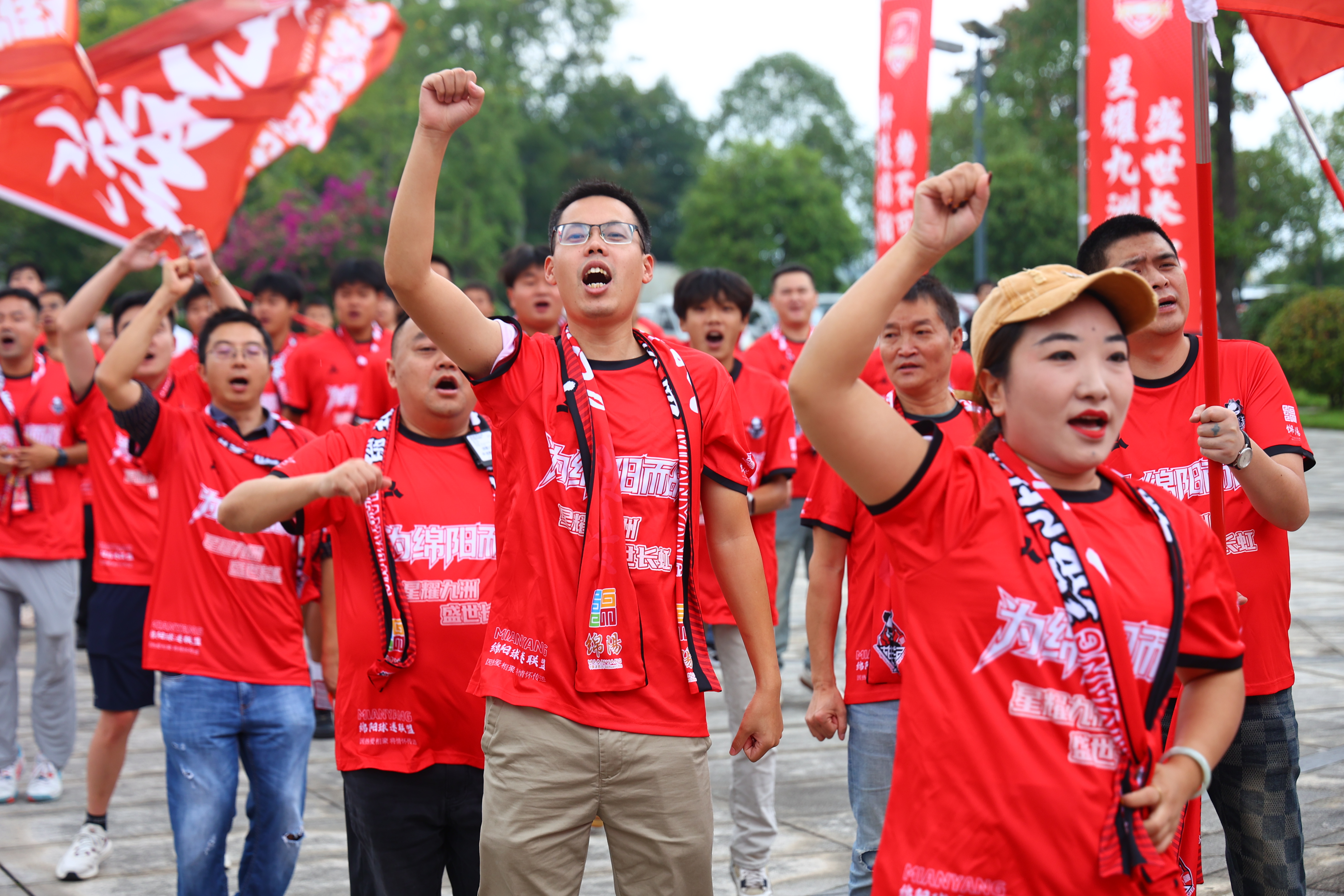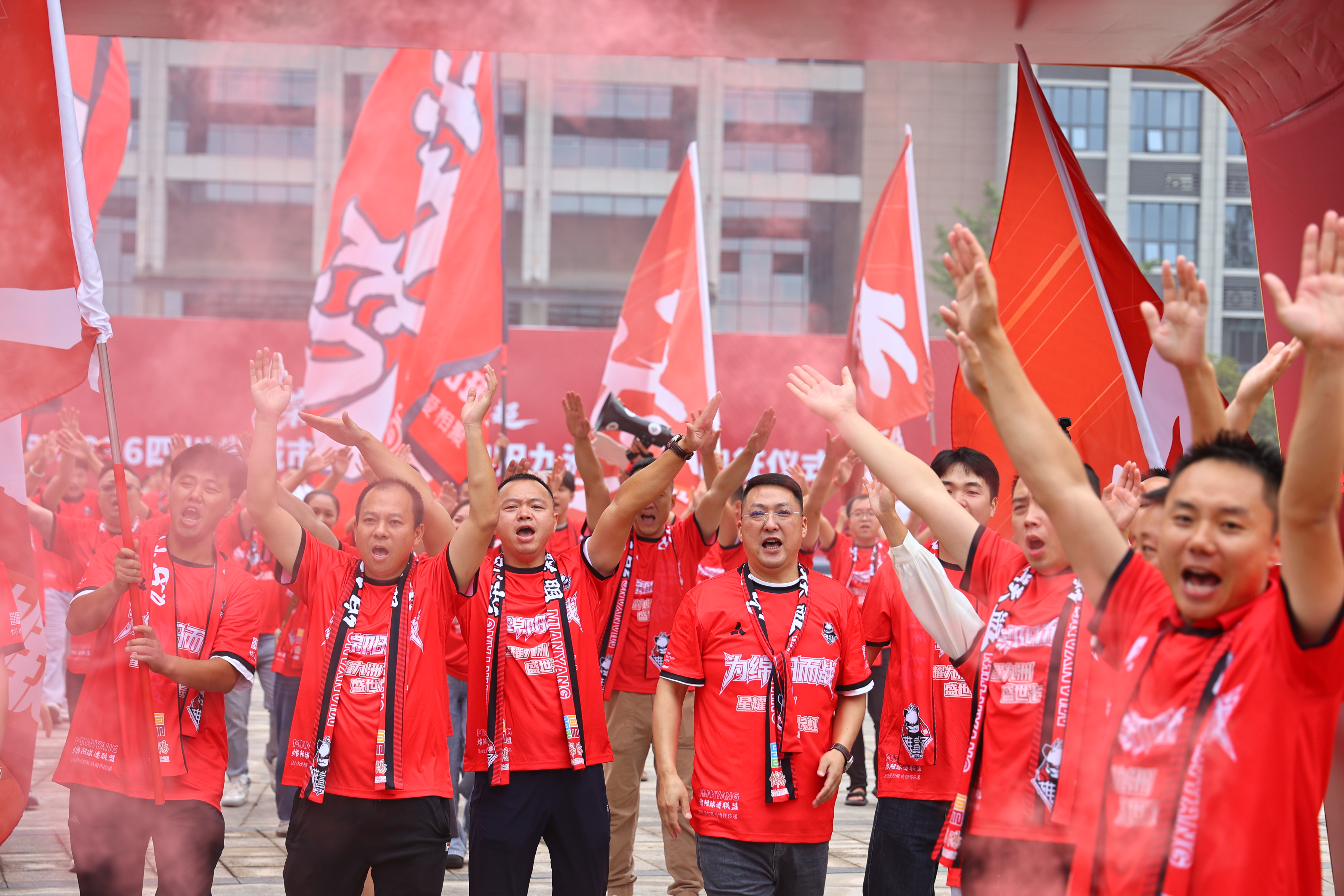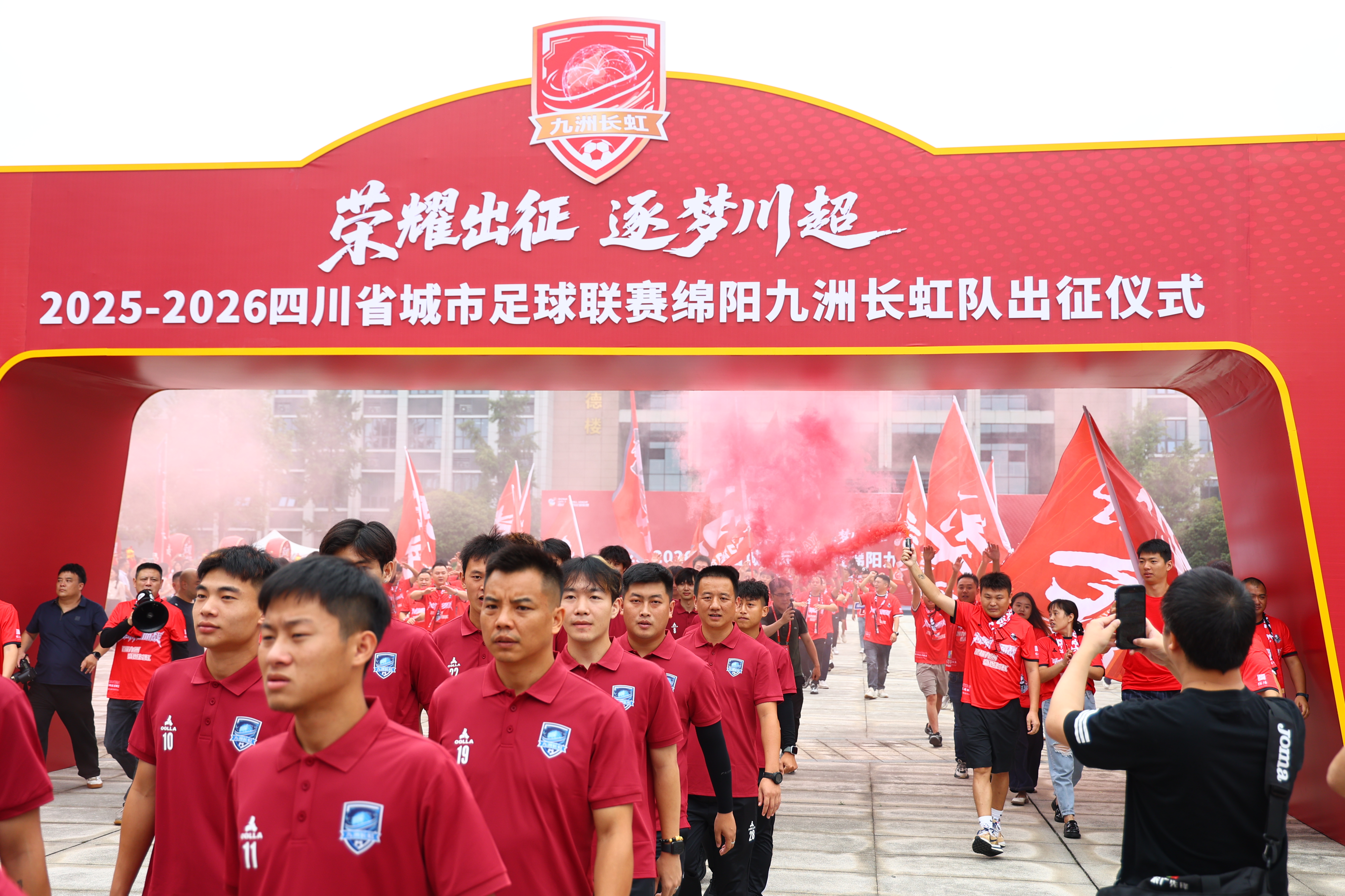 仪式现场,10面印着“荣耀出征”的战鼓分列两侧,丰谷啦啦队带来开场表演后 战鼓“咚!咚!咚!”奏响。 200余名球迷联盟成员身着红色助威服,挥舞队旗齐声高呼 “绵阳九洲长虹队,雄起!雄起!雄起!”